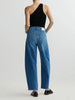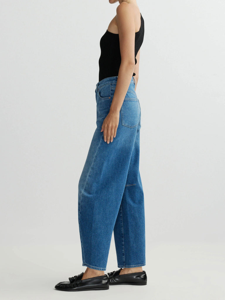 Miro Barrel is a high-rise, true barrel leg jean that is fitted at the hip with a 28" inseam, tapering at the leg.