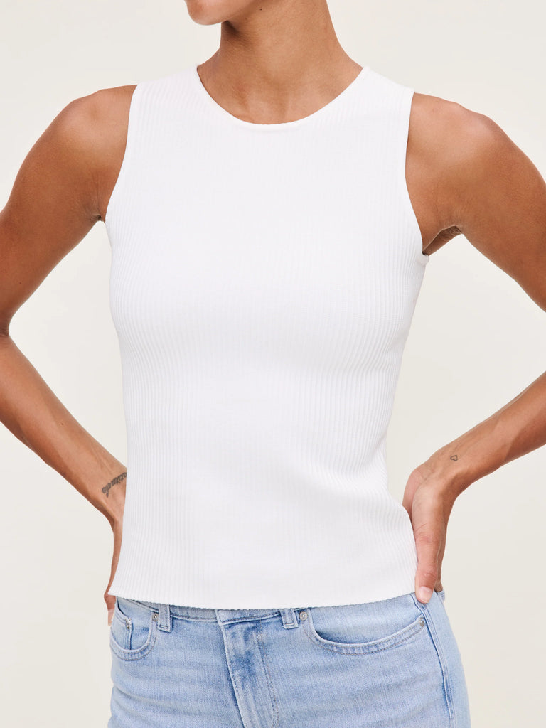 Details: White is a bright white sculpting rib knit with clean finishing.