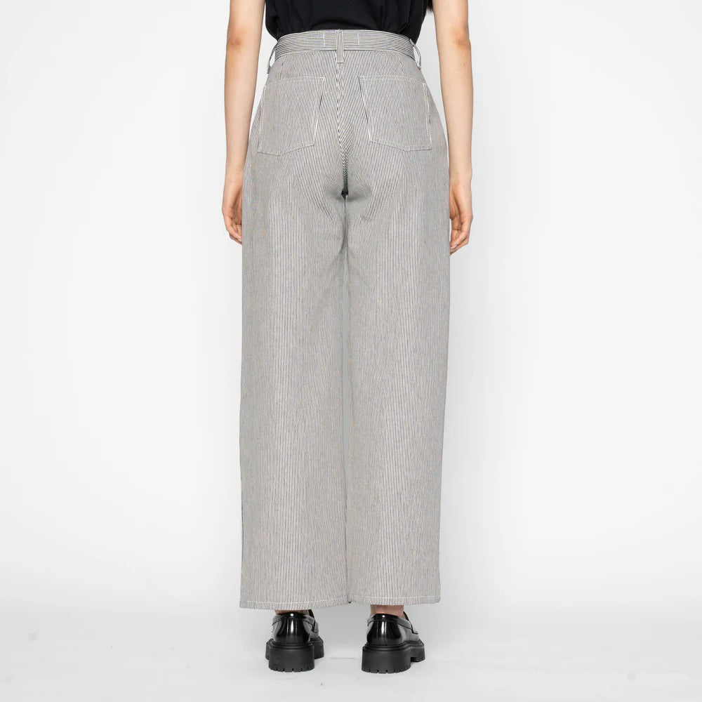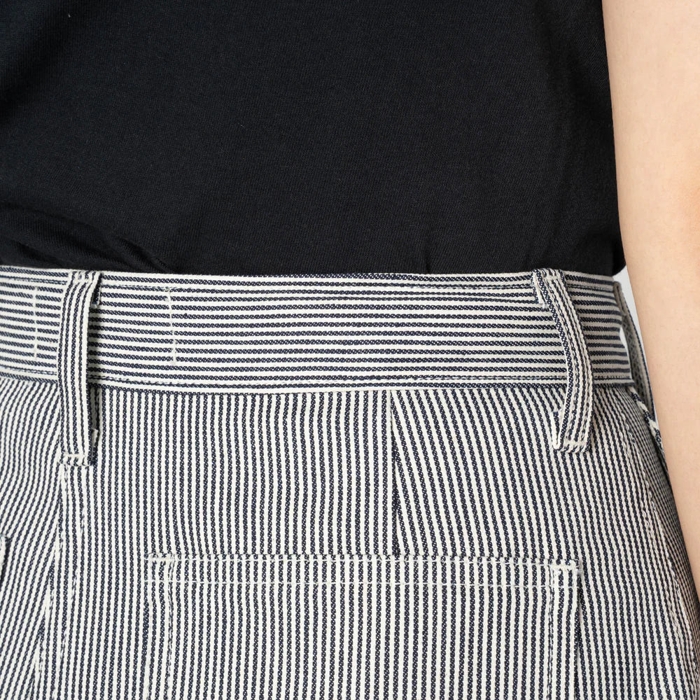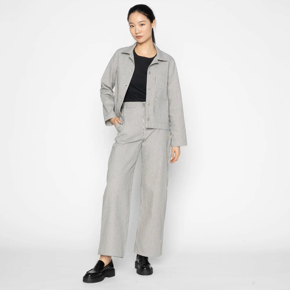Why We Love This Jean: The Organic Hickory is a Japanese fabric woven from 100% cotton at 10oz, featuring classic vertical indigo hickory stripes inspired by vintage railroad and utility garments. The fabric has a firm, structured feel that breaks in gradually with wear, maintaining its strong graphic character over time.