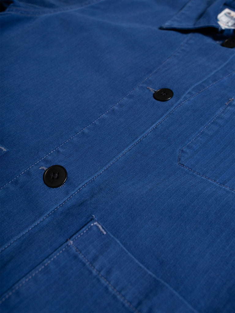 This Lovis jacket is crafted from exquisite herringbone twill fabric. Its tightly woven construction gives it a slightly crisp texture, a dry feel, and a smooth appearance. The pattern of the fabric pays homage to vintage herringbone twills, and to ensure longevity and desirable aging property, we have piece-dyed it in a perfect French blue shade. The jacket has undergone a gentle wash, subtly accentuating the fabric's characteristics and garment construction.