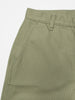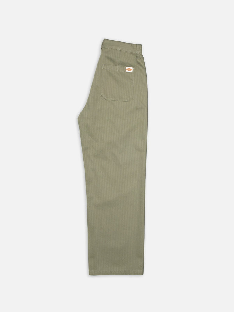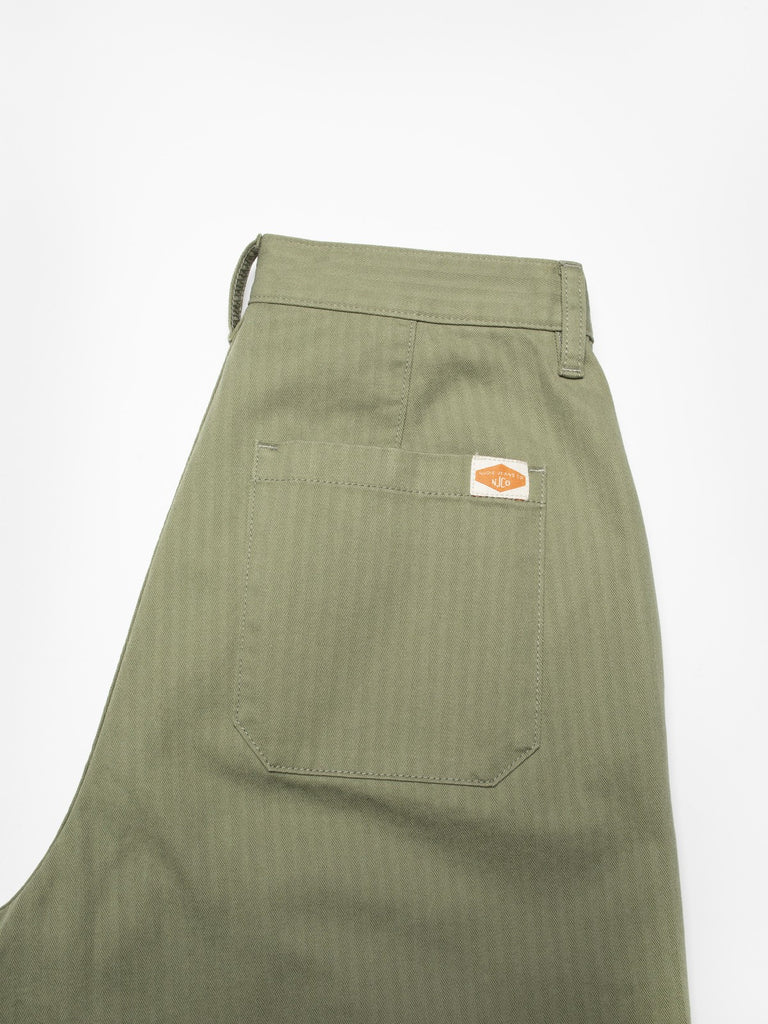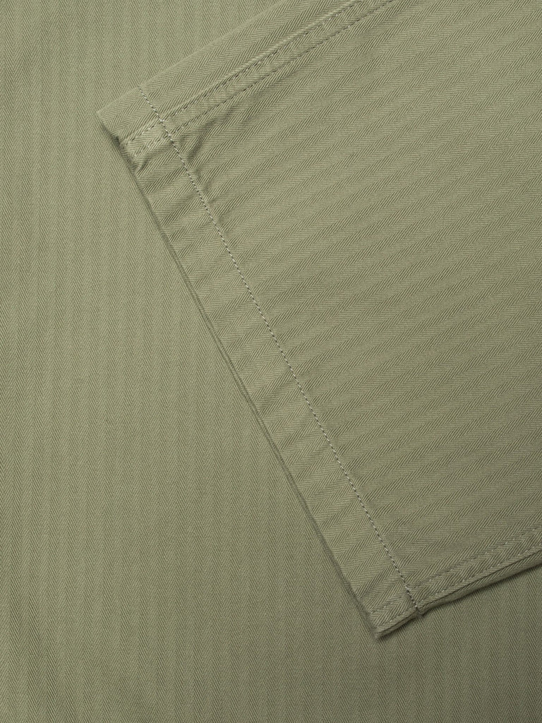 These Wendy pants are crafted from exquisite herringbone twill fabric. Its tightly woven construction gives it a slightly crisp texture, a dry feel, and a smooth appearance. The pattern of the fabric pays homage to vintage herringbone twills, and to ensure longevity and desirable aging property, we have piece-dyed it in a perfect sage green shade. The pants have undergone a gentle wash, subtly accentuating the fabric's characteristics and garment construction.