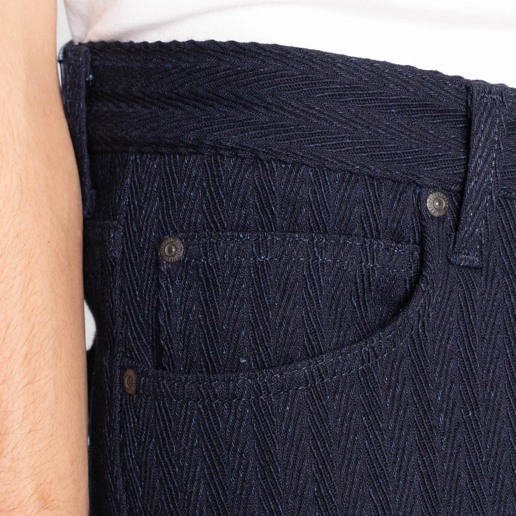 Why we love it: The Indigo Sugiaya is a 12oz Japanese herringbone twill, carefully fabric-rinsed for added comfort and a softened hand. This rinse treatment plumps up the fabric, enhancing the herringbone pattern with a three-dimensional depth that becomes even more pronounced with wear. The result is a beautifully textured, versatile fabric that balances both style and comfort. Other details include tonal stitching, black military-spec buttons and rivets, and a premium Horween Chromexcel Cavalier Ink pull-up leather patch that offers a touch of luxury and durability to this exceptional piece.