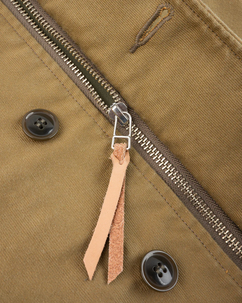 Another key difference between this lightweight jacket and our heavyweight models is the fabric used in construction. While this model is still cut from a tough 12oz whipcord, the yarns of this particular “jungle cloth” are dyed using sulphur dye. Unlike the fade-resistant reactive-dyed whipcord used for our traditional N1, this fabric is designed to fade with wear and washing, evolving with vintage charm to complement the WWII-era cut. Finished with a corduroy-lined collar that contrasts the whipcord, the result is a jacket that offers classic N1 styling at the perfect weight for the transitioning seasons.