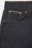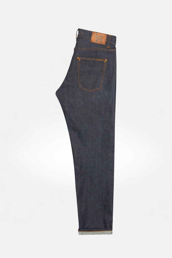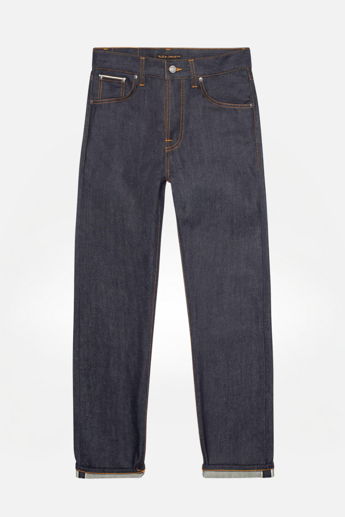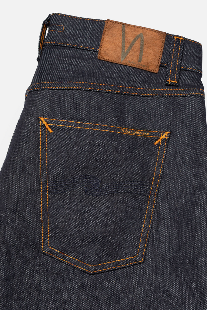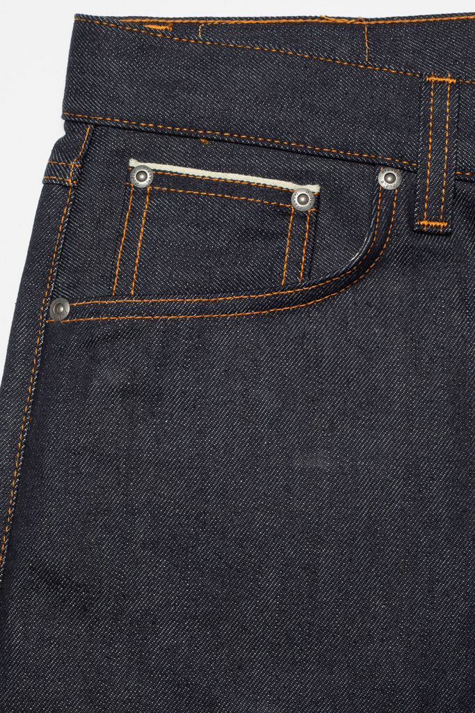 NJ´s signature orange thread provides a bold contrast, while the navy back pocket embroidery becomes more prominent as the denim ages. With wear, these selvage jeans develop a unique, worn-in character that is unique to the wearer.