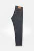 Regular-fit jeans with a tapered leg, made from 13 oz. rigid Turkish selvage denim crafted from organic and recycled cotton, dyed with pure natural indigo. The fabric features a neat all-white selvage ID and a gently slubby texture, with pronounced vertical twill lines. The deep, natural indigo tone gives these jeans a classic, well-balanced look.