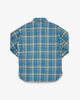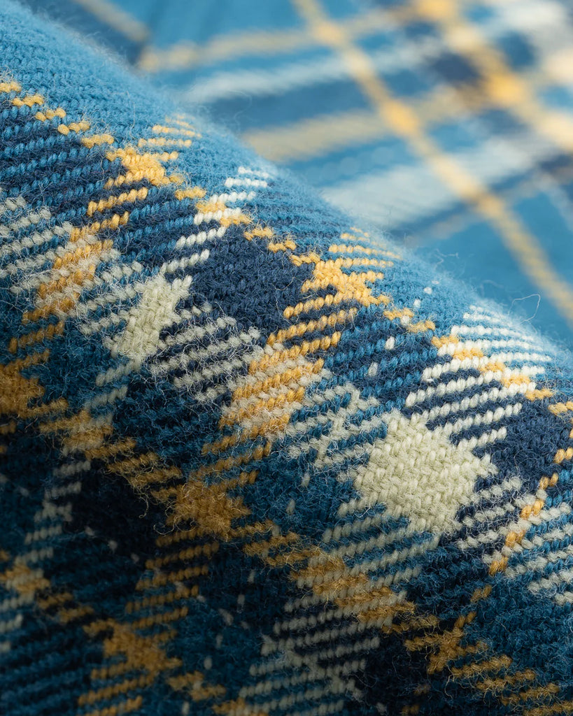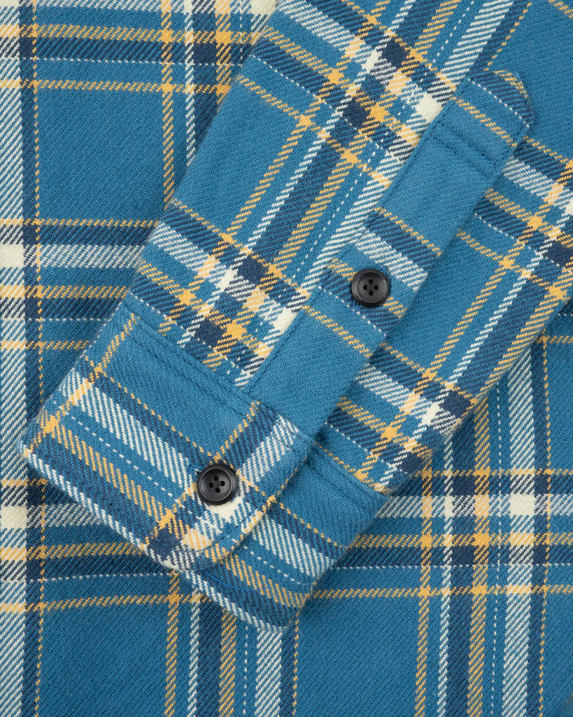 To a great extent, the ultra heavy flannel (UHF) shirts define Iron Heart: heavy, rugged, but amazingly wearable. The 12oz fabric is woven with Aspero cotton from the foothills of the Andes mountains. They double brush it on the inside and single brush it on the outside, resulting in a very soft yet substantial, thick, warm and windproof flannel. This shirt is a wardrobe staple—seen here in their work shirt cut with a blue American check.