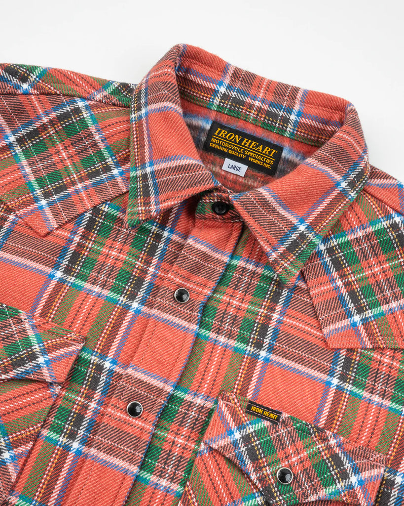 Why We Love It: To a great extent, our ultra heavy flannel (UHF) shirts define Iron Heart: heavy, rugged, but amazingly wearable. The 12oz fabric is woven with Aspero cotton from the foothills of the Andes mountains. We double brush it on the inside and single brush it on the outside, resulting in a very soft yet substantial, thick, warm and windproof flannel. This shirt is a wardrobe staple—seen here in our western cut with a red American check.