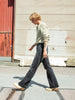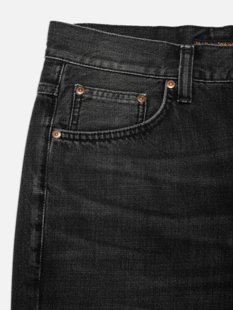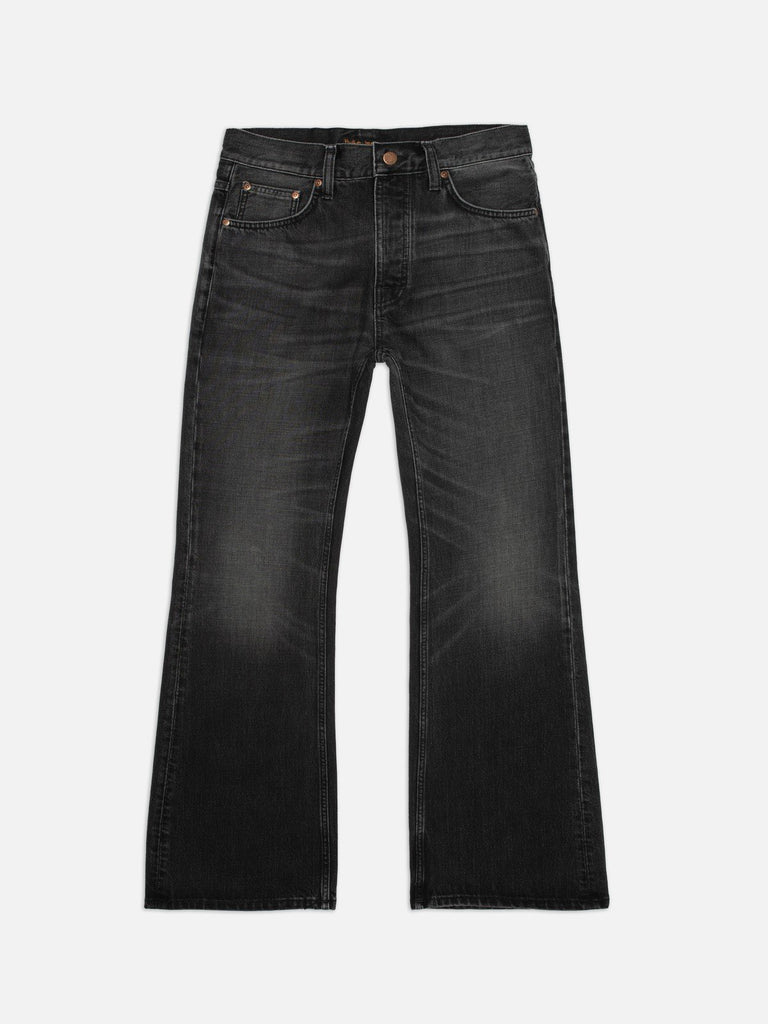 Why We Love It: A mid waist regular-fit jean with a flared leg, featuring a deep, richly textured black wash. Crafted from exceptional black-overdyed-black denim with pronounced slubbiness, the fabric reveals a striking salt-and-pepper grain and a subtle crosshatch texture. While highlighting contrasts, the wash preserves deep pitch-black tones, creating a beautifully dynamic and dimensional finish.