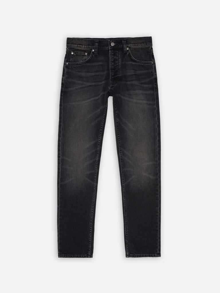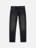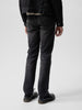 Slim-fit jeans with a slim leg, crafted from pitch-black denim with a defined texture. These jeans feature a striking contrast of highs and lows, enhanced by sharp abrasions and wear marks that deepen their worn-in look. The result is a beautifully rugged, well-aged appearance.