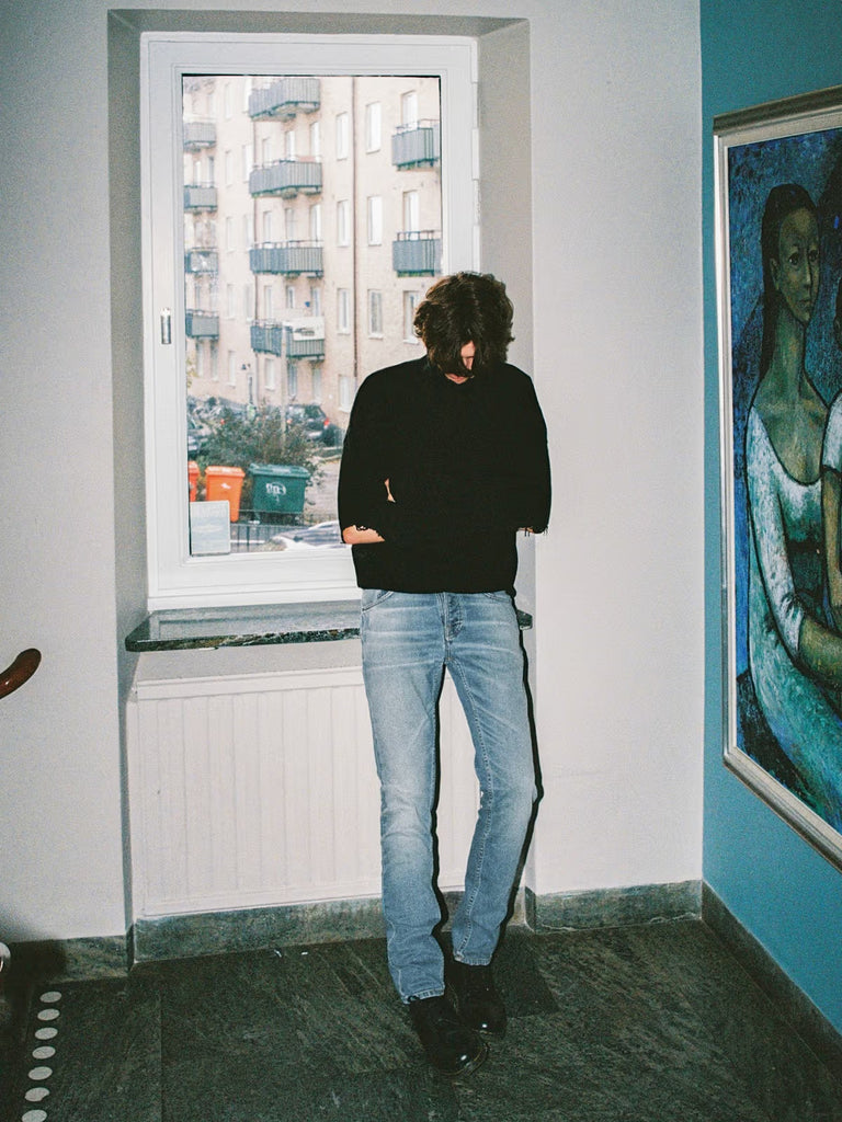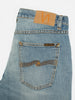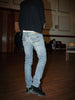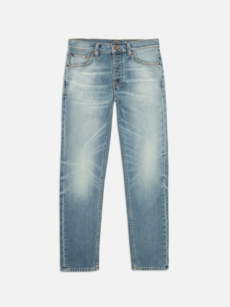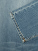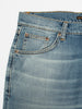 Slim-fit jeans with a mid waist and straight leg in a bright blue wash with near-white, warmly tinted highlights. Bold abrasions and sharp wear marks add depth and character in a refined yet authentic way. The denim’s slightly slubby texture stands out in the abraded areas, while the darker sections reveal clean twill lines and a subtle salt-and-pepper grain. A pleasing balance between softness and boldness