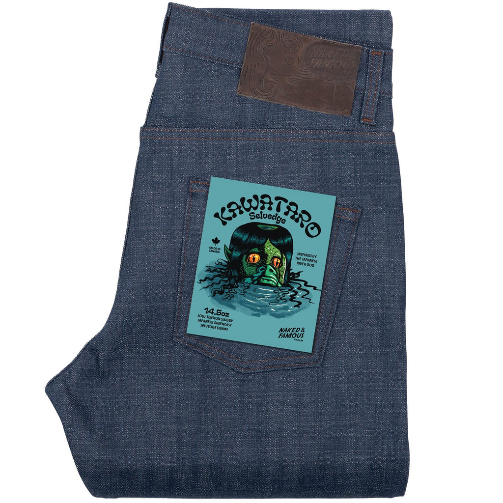 Why We Love It: The Kawataro Selvedge is a fresh greencast interpretation of our legendary Japan Heritage denim. It draws inspiration from Kawataro, the mischievous Japanese river God, also known as Kappa. Kappa is notoriously famous for his love of cucumbers, sumo wrestling, and playful trickery. Crafted from 14.5oz Japanese Selvedge denim, the Kawataro Selvedge features a distinctly slubby, uneven texture created through low-tension weaving and the use of irregularly-shaped slub yarns. The yarns are rope-dyed in indigo, and due to their unique shape, the dye penetrates unevenly thus resulting in varied absorption across the fabric. As the denim fades with wear, it reveals a striking spectrum of indigo shades, producing high-contrast, three-dimensional fades.