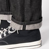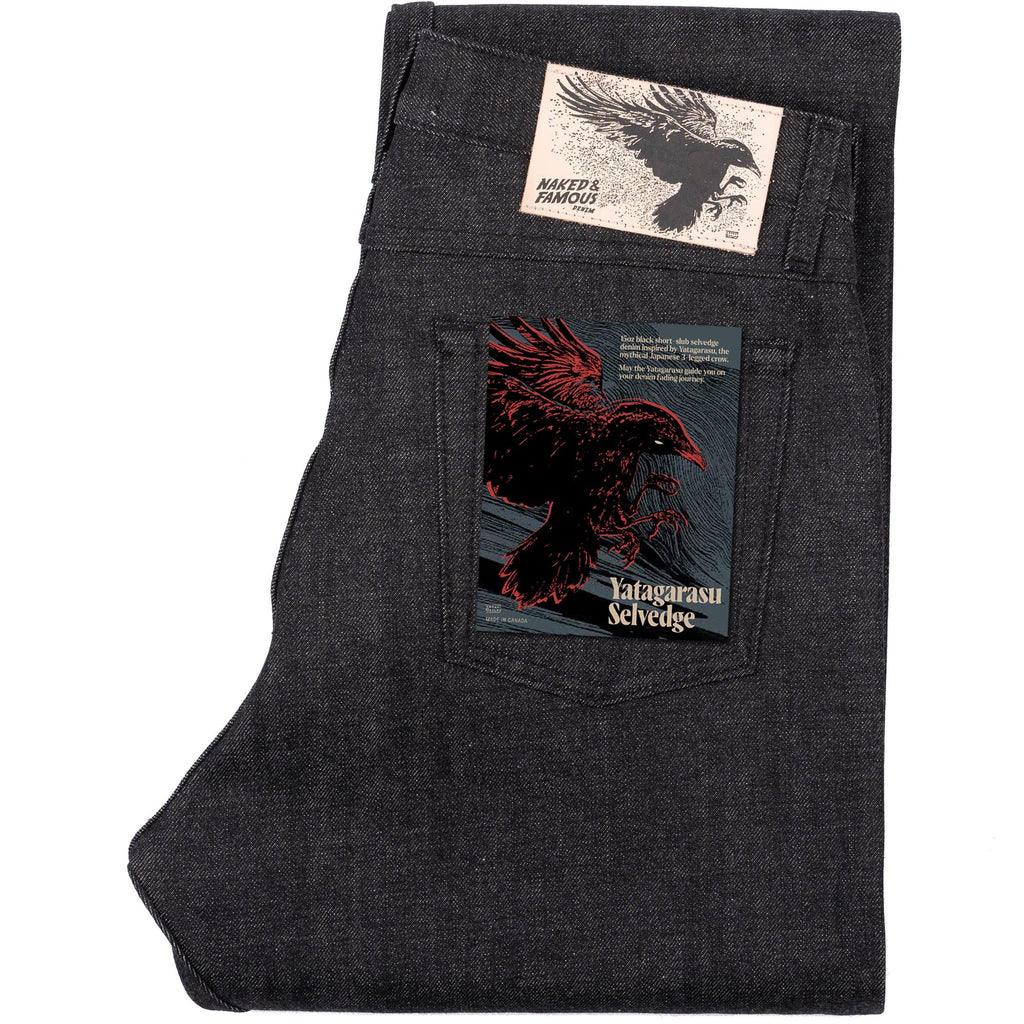 Why We Love It: The Yatagarasu Selvedge is a 15oz Japanese selvedge denim inspired by Yatagarasu, the mythical three-legged crow and revered Shinto God of guidance. This denim features a sulfur-dyed black warp that delivers a deep, rich tone from the outset. As the denim wears in, the contrasting white weft begins to emerge, creating dynamic, high-contrast fades unique to each wearer. Key details include tonal stitching, black pocket bags, pink selvedge ID, and black military spec copper buttons and rivets. The standout natural vegetable-tanned leather patch featuring metallic black foil artwork by renowned Canadian artist Jacqui Oakley, adds a powerful visual element to this mythologically-inspired piece.