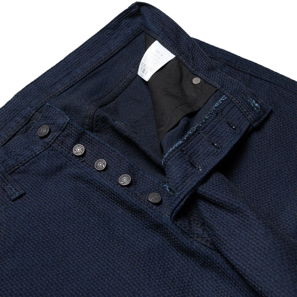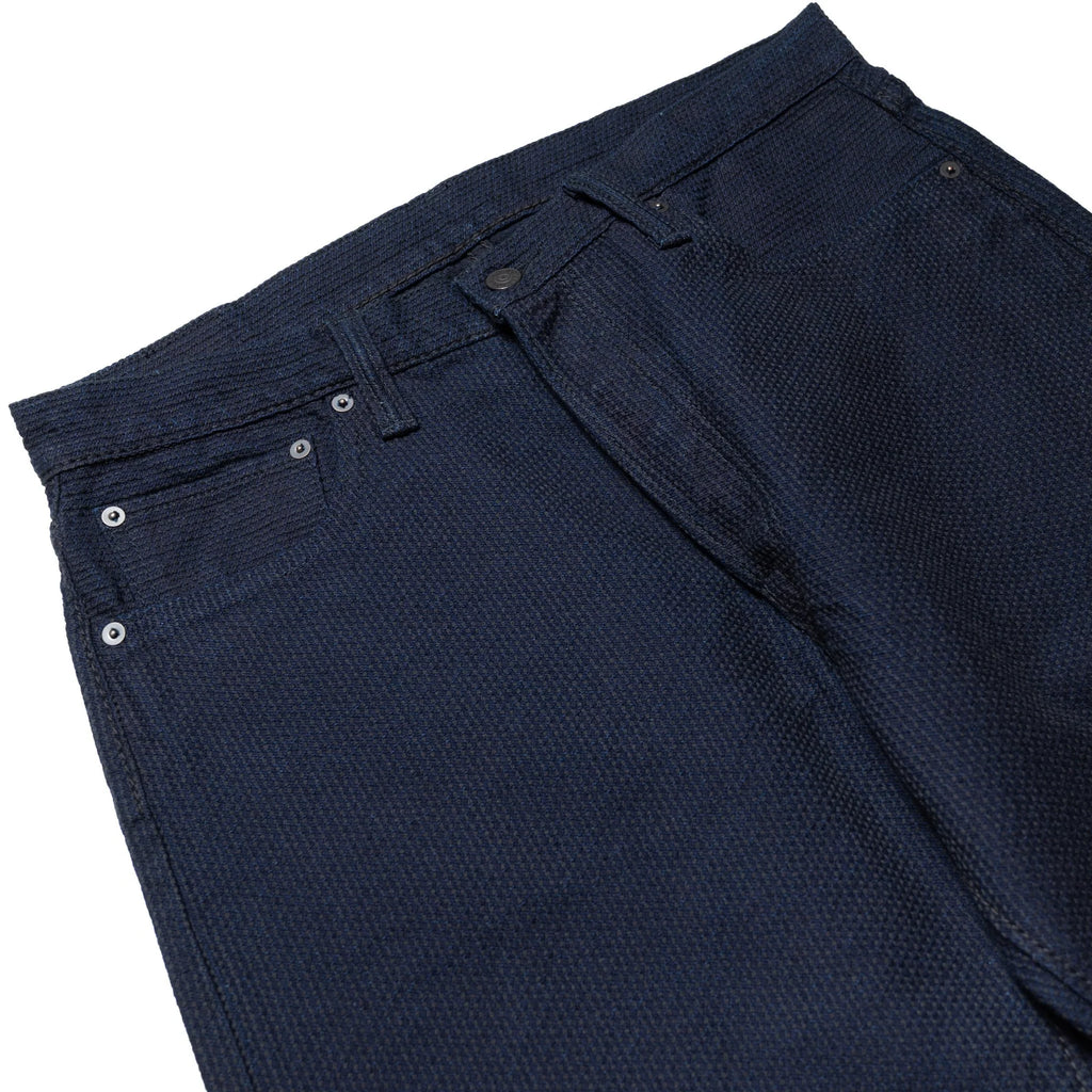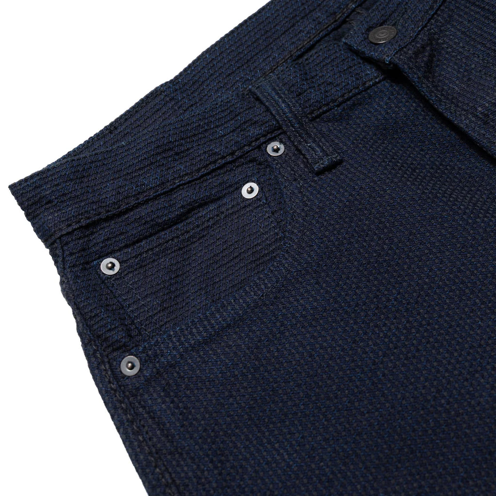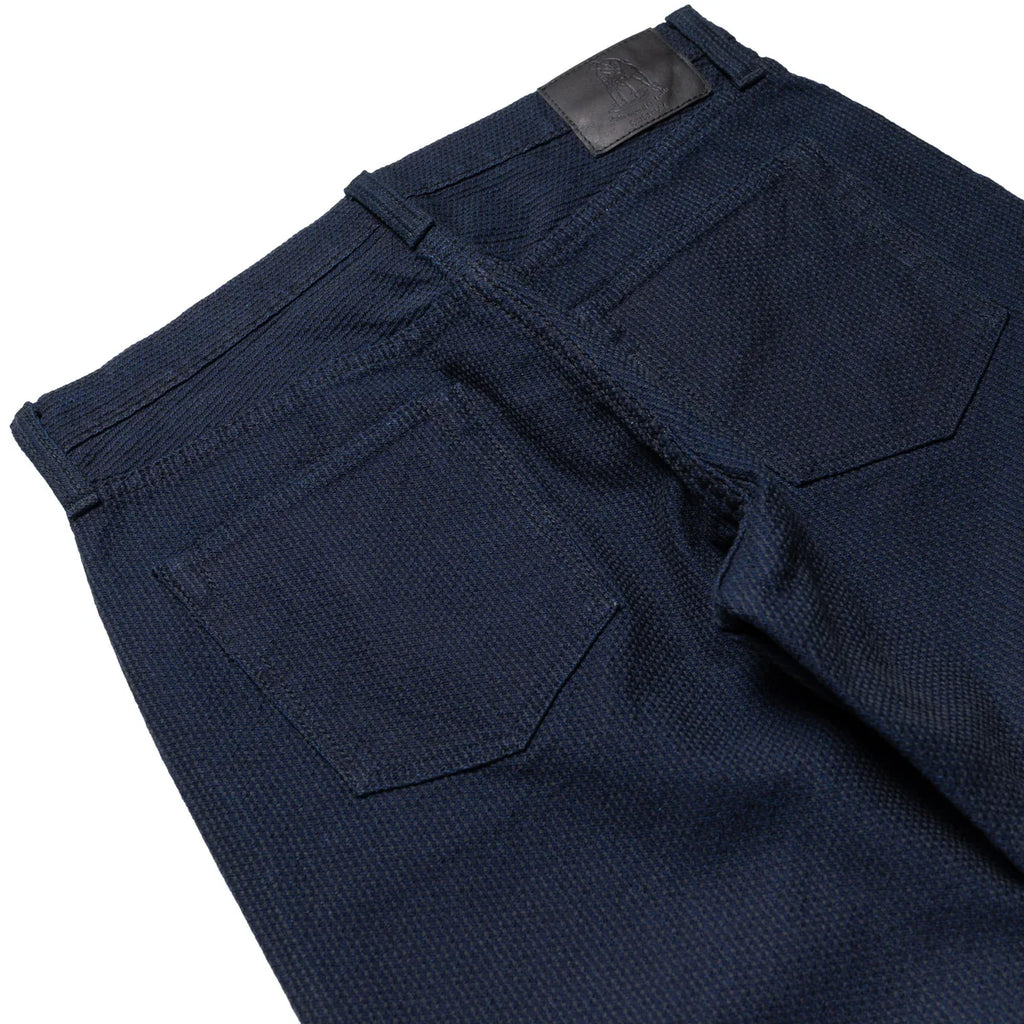 Pure Blue Japan Sashiko Pants in their Regular Fit and a Indigo x Black Sashiko fabric. These feature the same original jacquard weave Sashiko as found on their jackets, but in a 5 pocket pants style, with a roomy top block and is straight through the knees on down. These will fade beautifully with wear and are an easy pair to wear from the start.