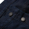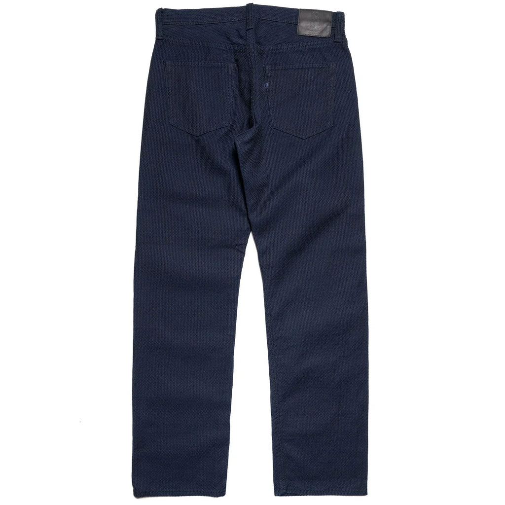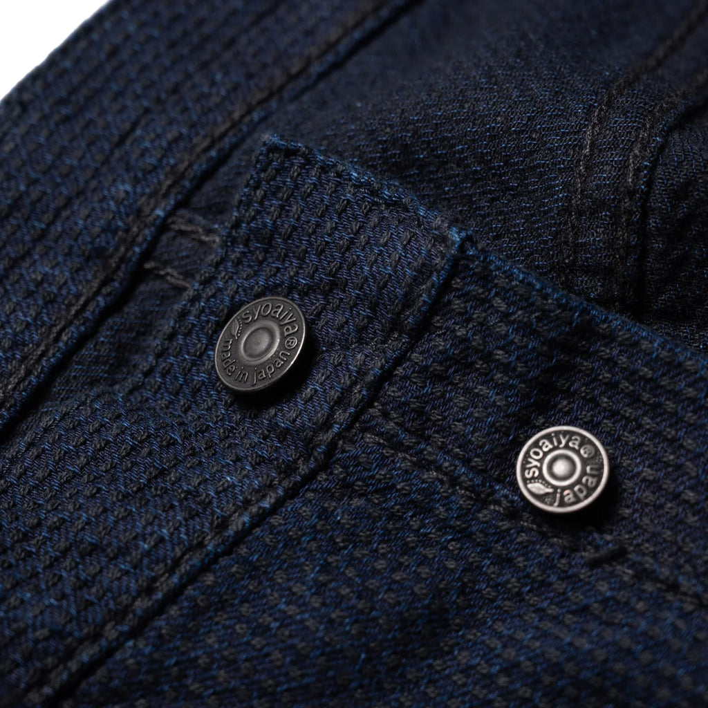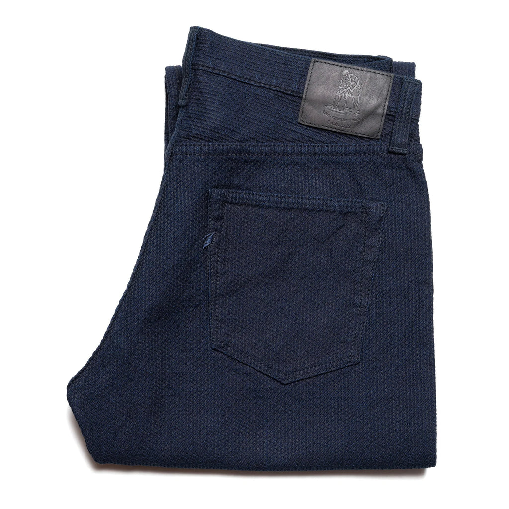 Pure Blue Japan Sashiko Pants in their Regular Fit and a Indigo x Black Sashiko fabric. These feature the same original jacquard weave Sashiko as found on their jackets, but in a 5 pocket pants style, with a roomy top block and is straight through the knees on down. These will fade beautifully with wear and are an easy pair to wear from the start.