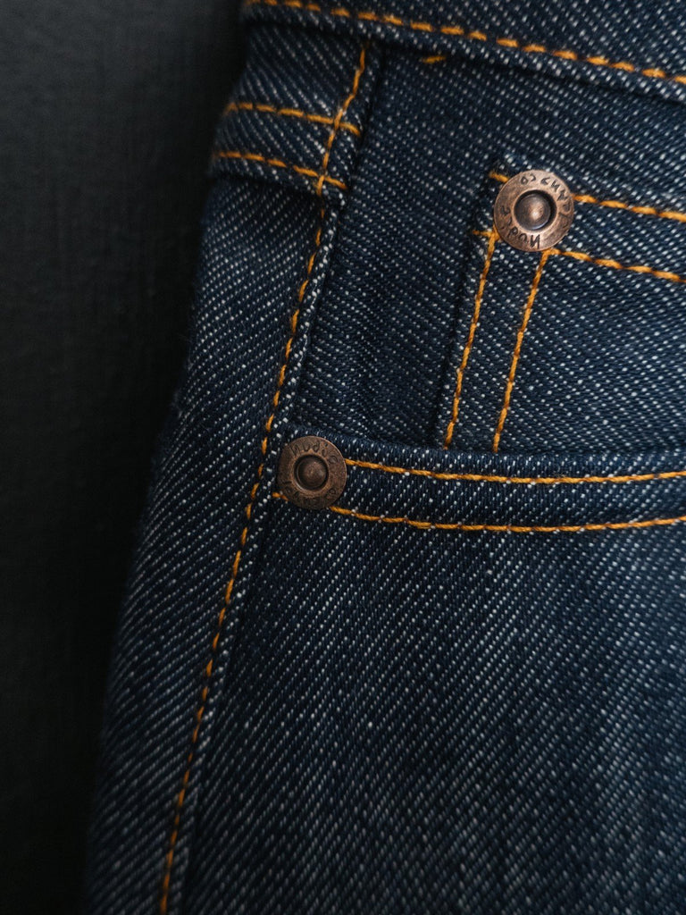 The Gritty Jackson Dry Sunburns stands out with its gradient back pocket embroidery, shifting from deep orange to pale yellow, with our own Nudie Jeans Orange at the center. Paired with a special graphic Jacron patch, it subtly plays with our identity and iconography.